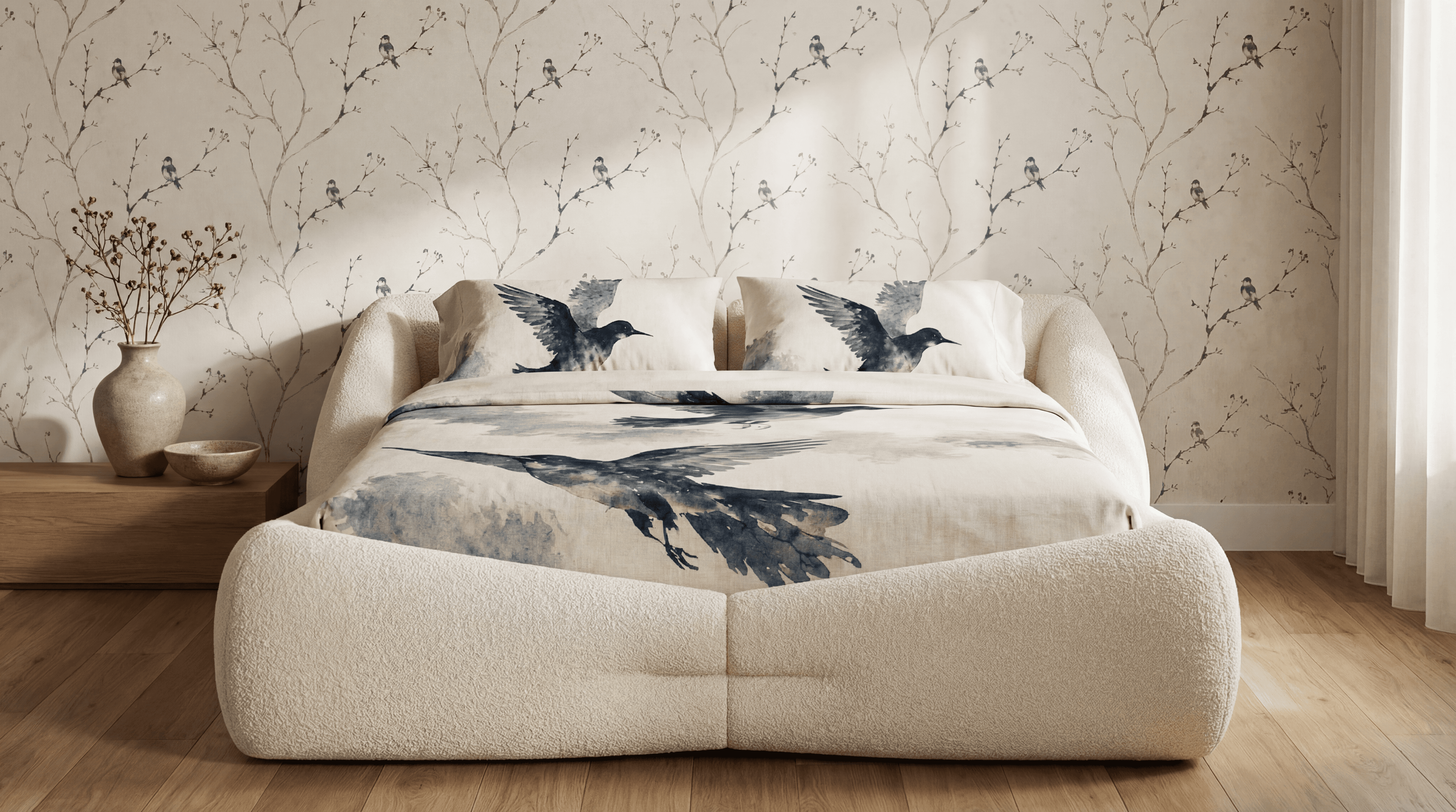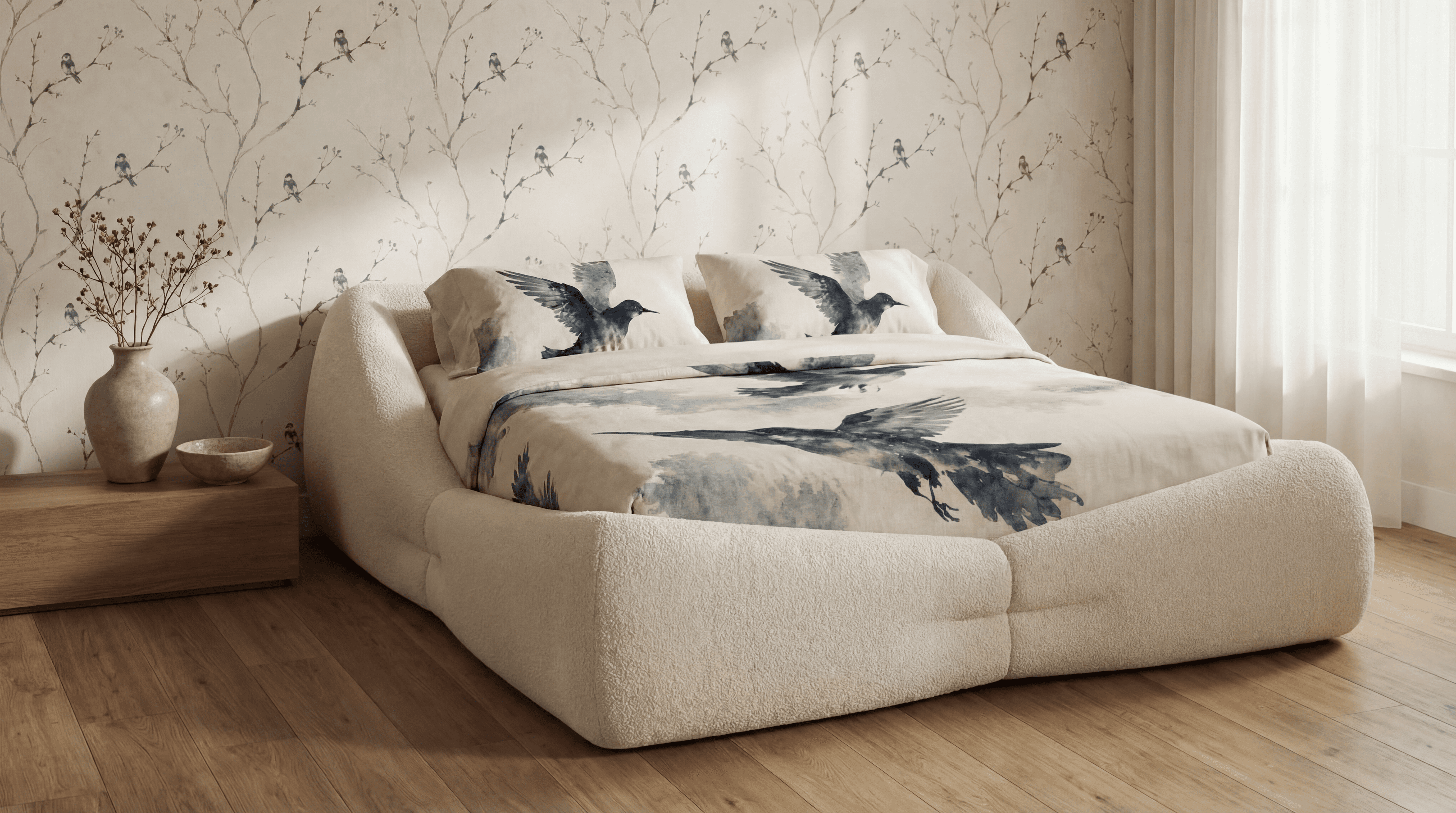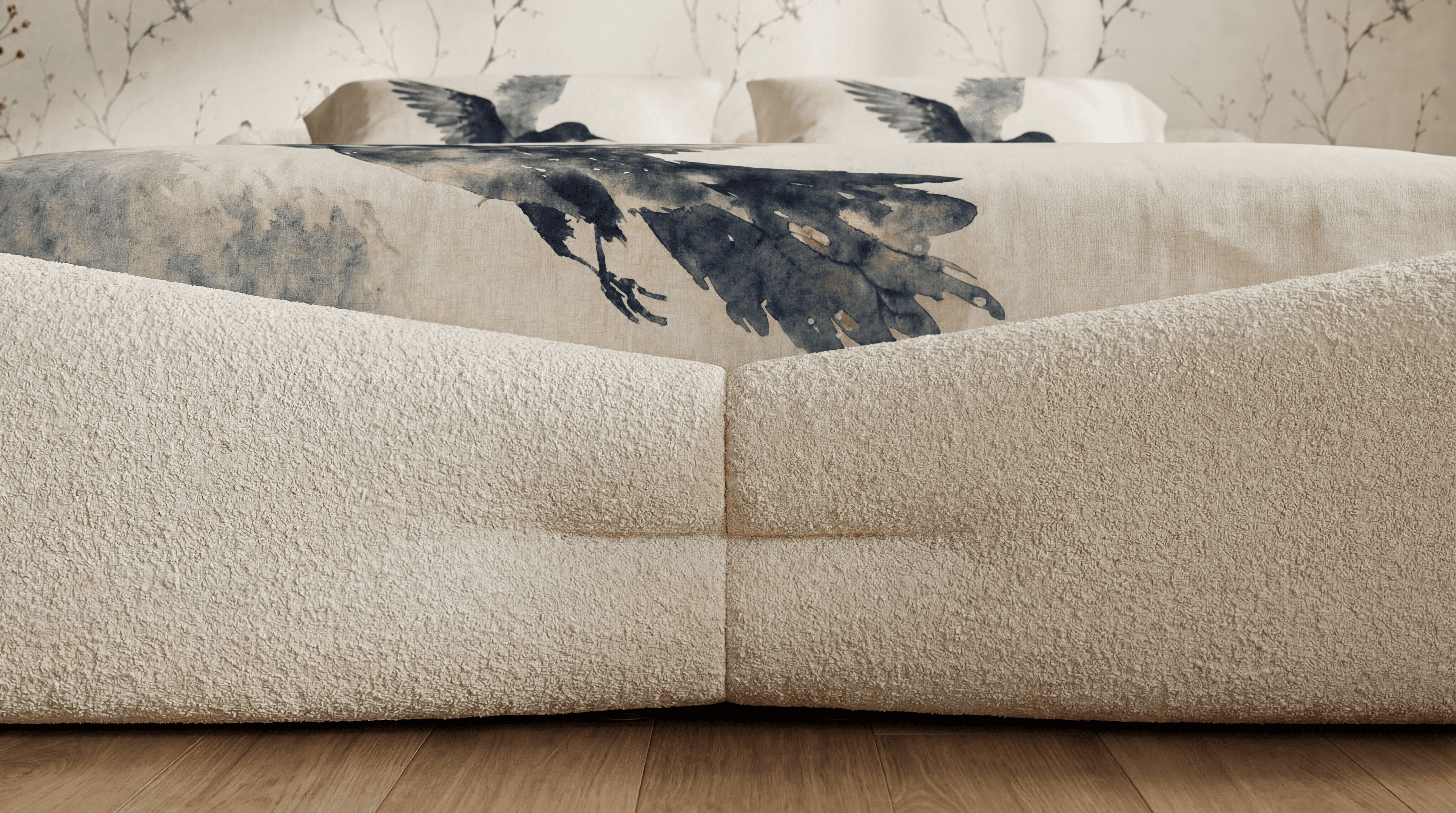 Photorealistic 3D visualization of the Mon Nid bed by Cassina, designed by Patricia Urquiola. A contemporary refuge that transforms sleep into a protective embrace: generous, enveloping forms, signature stitching, and extraordinary softness achieved through recycled polyester padding. Free from polyurethane and fully disassemblable, Mon Nid represents Italian design that perfectly combines extreme comfort, sculptural aesthetics, and a circular approach.